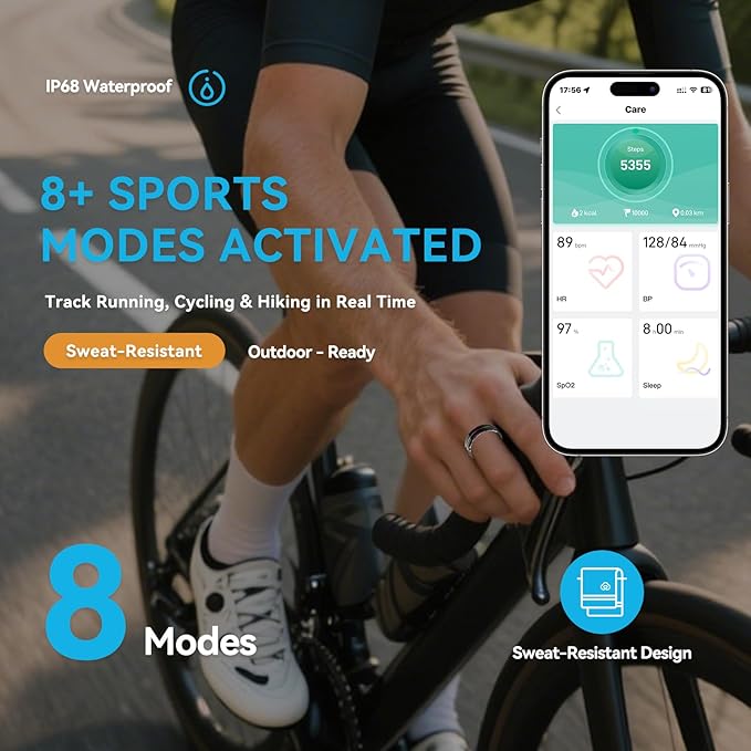- 【8 Smart Activity Modes — Auto Step & Movement Detection】More than just a ring: it’s an activity tracker ring that automatically detects steps, distance, and calories—no buttons needed. Supporting 8+ modes (walking, running, cycling, and more), this step tracker ring syncs seamlessly with your app, making it a sleek fitness tracker ring for every workout.