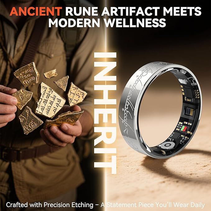 - 【Mystic Runes × Smart Wellness Tracking】Ancient runes meet modern tech. This IP68 waterproof smart fitness ring features deeply etched runes, blending timeless style with advanced tracking. Unisex design discreetly monitors daily activity, rest, and movement—syncs instantly to your phone via Bluetooth. Whether you need a fitness tracker ring, sleep tracker ring, or unique anillo inteligente, it adds purpose and mystique to every day, even through hand washes or light rain. FRAY