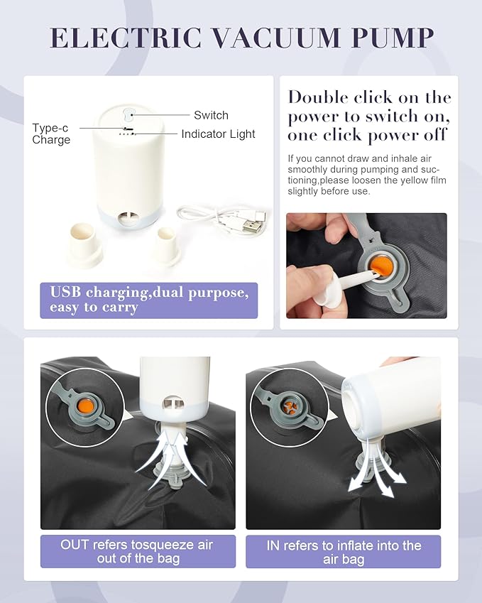 - Vacuum Compression More Space: This vacuum compression travel bag comes equipped with a vacuum pump, featuring built-in valves or an included air pump, enabling quick and effortless compression of clothing for lighter travel. Simply connect the included vacuum pump to the air port, press the button to rapidly extract or release air, effectively saving space and maximizing storage capacity. This vacuum backpack is the ideal choice for international travel, business trips, or weekend getaways.