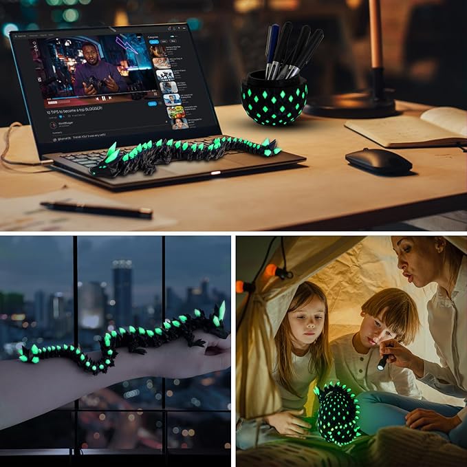 - 【3D Printed Glow-in-the-Dark Dragon Egg with UV Light】Watch the 3D printed dragon egg and articulated dragon glow neon-bright! Perfect as glowing home decor by day and an interactive crystal dragon toy by night