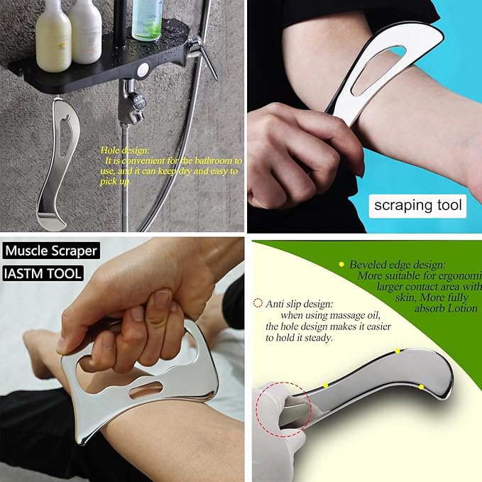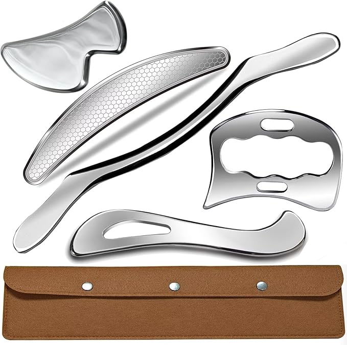 - PROFESSIONAL DESIGN: 5-in-1 stainless steel muscle scraper set featuring different edge shapes and curves for versatile soft tissue massage techniques