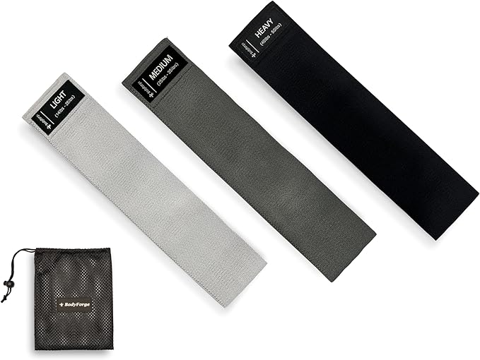 - PREMIUM EXERCISE BANDS: BodyForge Fabric Hip resistance bands come in 3 varying resistance levels (Light 14-25lbs, Medium 25lbs -35lbs, Heavy 40lbs-50lbs). Made with a soft cotton material, these wide bands offer comfort while preventing pinching and snapping. The built in latex grip prevent the band from slipping or rolling while exercising. The 14″ by 3″ bands offer a great variety of exercise options whether you are just beginning your workout journey or been working out for years.
