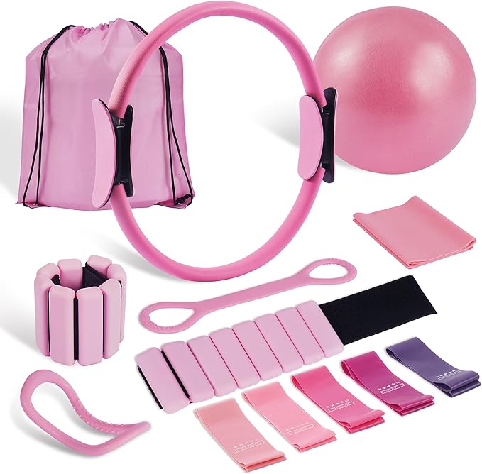 - All-in-One 13 Pcs Pilates Kit: Includes pilates ring and ball set, 2 wrist & ankle weights (1 pound each), 5 exercise bands, 1 elastic band (59 inches), 1 8-shape resistance band, 1 stretch ring, and a gym bag. Made from high-quality materials for lasting durability, this is the perfect Pilates kit for women, designed to meet your diverse exercise needs.