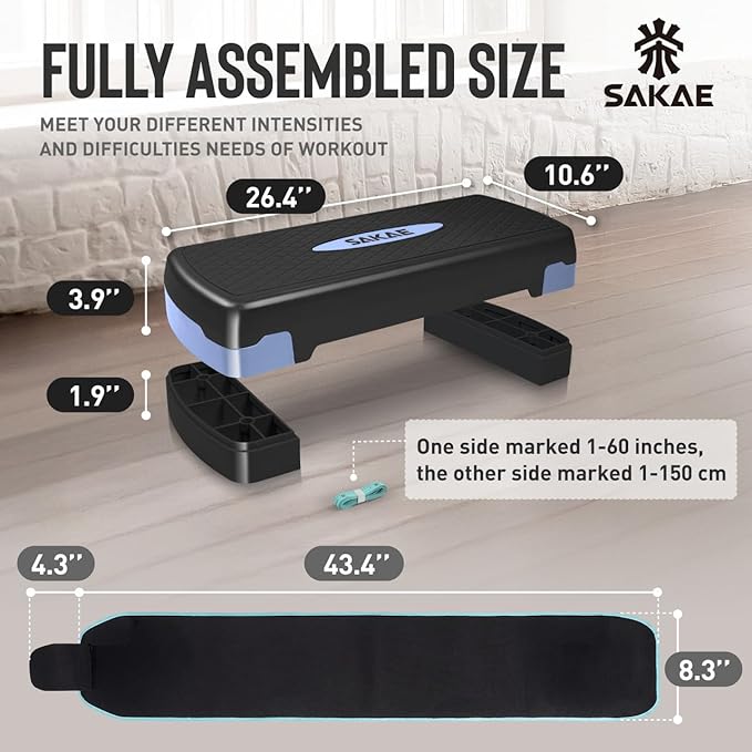 - 2 Level Height Adjustment: Includes 2 risers to easily switch between 4” and 6” heights; supports varied workout intensity to help improve training and burn more calories; features a blue black stepper; overall size is 26.4” W x 10.6” D x 3.9–5.8” H