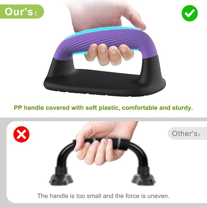- Wide Push-Up Grip for Comfort: Each push up handle is 1.6 inches wide and ergonomically shaped to fit your palm. The soft plastic push-up handles provide a secure, non-slip grip, minimizing hand fatigue and maximizing comfort during pushups and push-up bar workouts