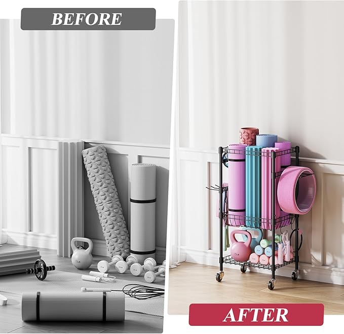 - All-in-One Yoga & Home Gym Storage Solution:Our 2-tier rolling organizer is the ultimate yoga mat storage and home gym storage system, designed specifically for fitness enthusiasts. It neatly stores yoga mats, foam rollers, resistance bands, dumbbells, and more—keeping your space tidy and clutter-free. Perfect for homes, garages, and yoga studios
