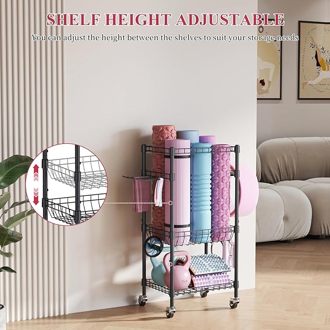 - Versatile & Space-Saving Organization The yoga mat storage rack maximizes vertical storage with 3 adjustable shelves and multiple hooks—including 4 movable side hooks and 2 rows of multi-functional hooks. Hang resistance bands, towels, yoga straps, or small accessories while storing mats and rollers vertically. Saves floor space and keeps everything accessible