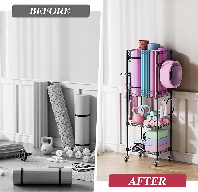 - All-in-One Yoga & Home Gym Storage Solution:Our 3-tier rolling organizer is the ultimate yoga mat storage and home gym storage system, designed specifically for fitness enthusiasts. It neatly stores yoga mats, foam rollers, resistance bands, dumbbells, and more—keeping your space tidy and clutter-free. Perfect for homes, garages, and yoga studios