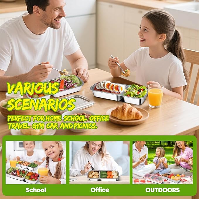 - 【Versatile 3-Compartment Design for Snacks, Fruits & Sauces】The divided stainless steel bento box features 3 leak-proof compartments to separate snacks, fruits, dips, or sauces without mixing flavors. Ideal for meal prep, picnics, or school lunches, it’s a reusable snack container with lids that prevents spills.