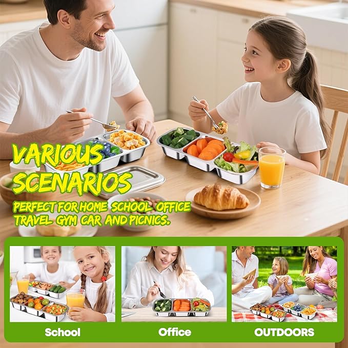 - 【Versatile 3-Compartment Design for Snacks, Fruits & Sauces】The divided stainless steel bento box features 3 leak-proof compartments to separate snacks, fruits, dips, or sauces without mixing flavors. Ideal for meal prep, picnics, or school lunches, it’s a reusable snack container with lids that prevents spills.
