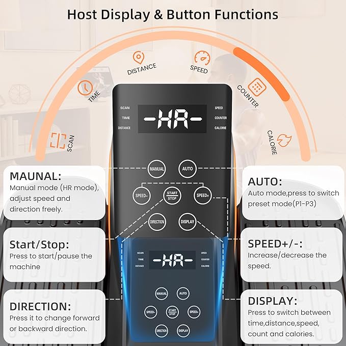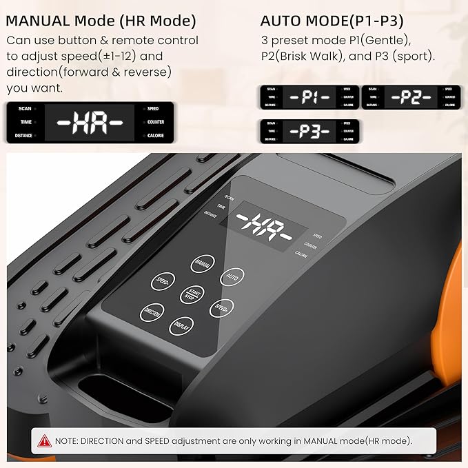 - 1.Auto & Manual Modes: Experience versatile workouts with automatic programs (P1-P3) , each with pre-set intervals that automatically vary speed and switch between forward and backward motion to keep your workout engaging. For complete control, use Manual Mode(HR Mode) to customize your pace across 12 speed levels and seamlessly change pedal direction at any time.
