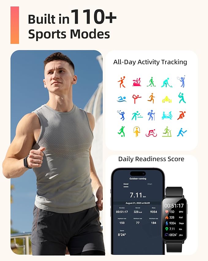 - 【PEDOMETER WITH 110+ BUILT-IN SPORTS MODES & ALL-DAY ACTIVITY TRACKING】Stay motivated with our versatile fitness watch featuring over 110 built-in exercise modes—no extra setup needed! From walking, running, cycling, and swimming to yoga and gym training, it tracks your heart rate, steps, and calories with precision. Explore new activities freely and turn daily effort into meaningful progress. Stylish and convenient, this smartwatch keeps you connected to your goals every step of the way.