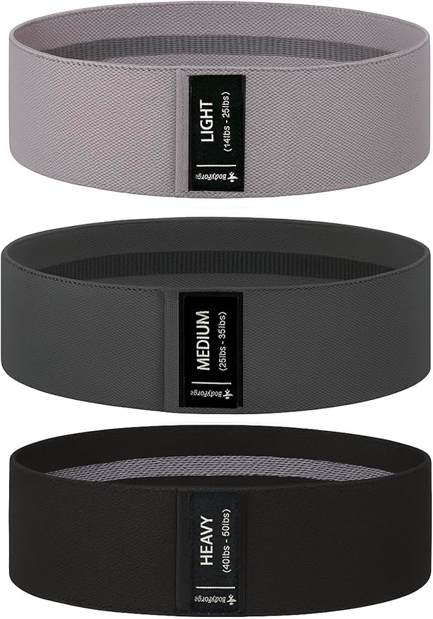- PREMIUM EXERCISE BANDS: BodyForge Fabric Hip resistance bands come in 3 varying resistance levels (Light 14-25lbs, Medium 25lbs -35lbs, Heavy 40lbs-50lbs). Made with a soft cotton material, these wide bands offer comfort while preventing pinching and snapping. The built in latex grip prevent the band from slipping or rolling while exercising. The 14″ by 3″ bands offer a great variety of exercise options whether you are just beginning your workout journey or been working out for years.
