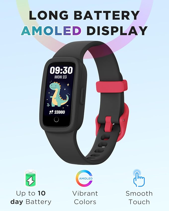 - Brilliant AMOLED Screen: Experience crystal-C clarity and smooth interaction with the upgraded AMOLED screen—a big leap from ordinary LCD displays. This kids fitness watch lasts up to 10 days on one charge, keeping up with your child's day and night activities.