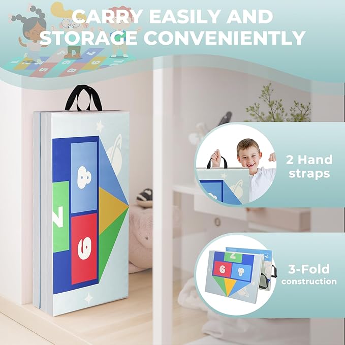 - 【EASY TO STORE & CARRY, & CLEAN】 The 3-fold design makes the kids gym mat storage convenient and saves your space.2 carrying handles make it easy for transportation. You only need to wipe it with a damp cloth and then pat it dry. Pro Tip: Avoid alcohol