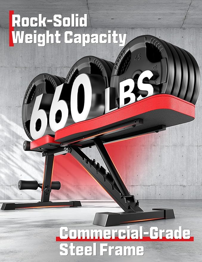- đ´ă660LBS Heavy-Duty StabilityăBuilt with commercial-grade steel and a triangular support structure, this weight bench delivers rock-solid stability for intense workouts. Rigorously tested to support up to 660LBS, it ensures safe lifting for bench presses, dumbbell exercises, and full-body training. Non-slip rubber feet keep it steady on any floor, while the reinforced frame prevents wobblingâno more shaky workouts!