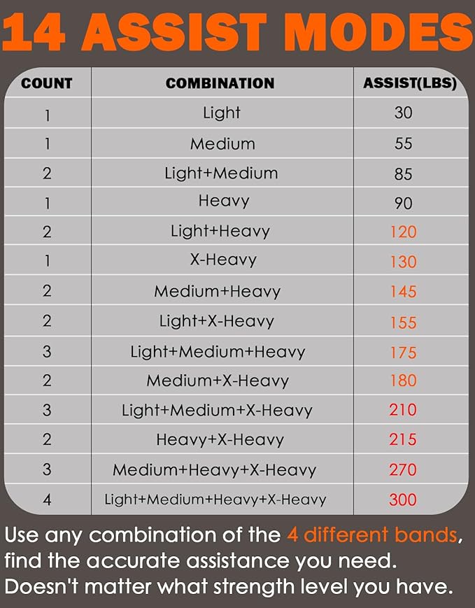 - Customizable Resistance Levels - We provide 4 different resistance bands that can be easily detached, each band has two triangular carabiners with locking mechanism. With up to 14 possible combinations, you can adjust the level of assistance to suit your strength needs.