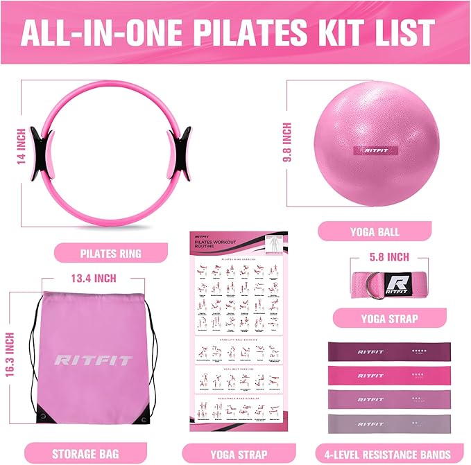 - ALL-IN-ONE PILATES KIT: The home pilates kit Includes 14" Pilates Ring + 9.8" Pilates Ball + 4 Lever Resistance Bands (5-10lb, 10-15lb, 15-20lb, 20-25lb) + Yoga Strap + Workout Guide + Storage Bag. Providing everything you need for a full body pilates workout.