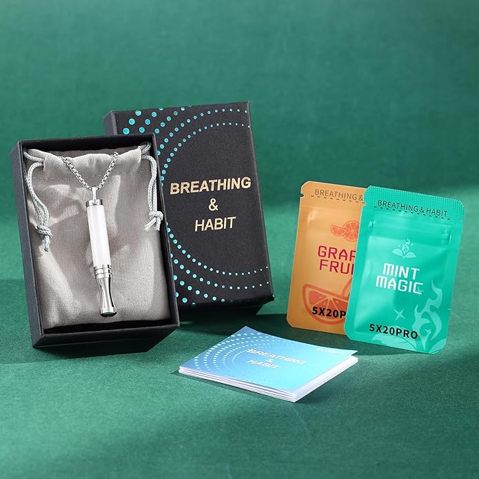 - Breathe Free Necklace — Find ease with every exhale. Rooted in traditional Japanese breathwork, this breathing necklace uses gentle resistance to slow your exhale, signaling relaxation and naturally relieving stress. It supports mindfulness, meditation and focus; helps you wind down before sleep; and pairs with emotional balance, breathwork, and yoga—perfect for self-soothing and self-regulation
