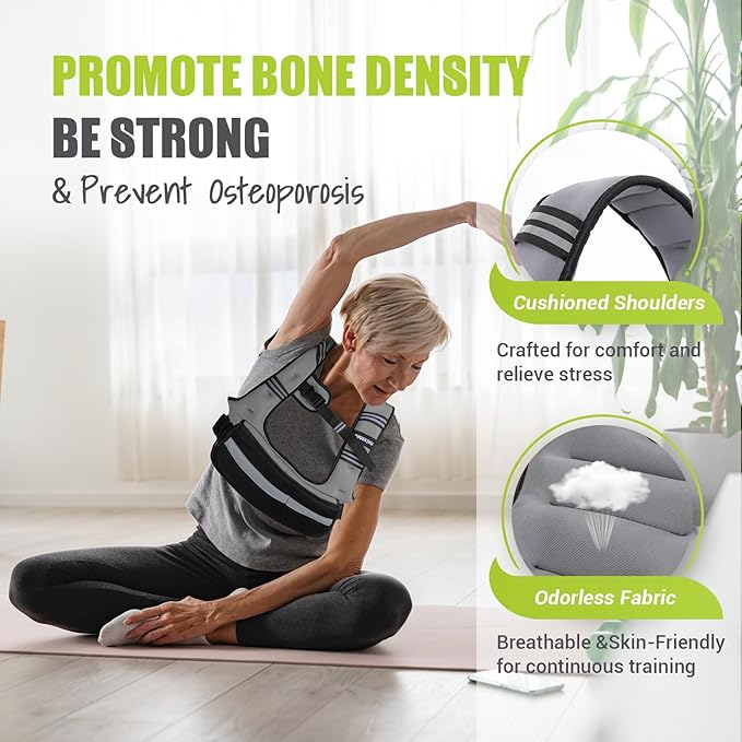 - [SCIENCE-BACKED BODY WEIGHTED VEST: MUSCLE STRENGTHENING] Scientifically proven to help prevent osteoporosis, our weighted workout vest enhances bone density, builds muscle strength, and improves balance and posture—especially for middle-aged and elderly women. This weighted vest for women adjustable weightis crafted with breathable, sweat-wicking neoprene and evenly distributed iron sand filling, ensuring comfort, dryness, and stability during weight training, yoga, walking, or prolonged workouts.
