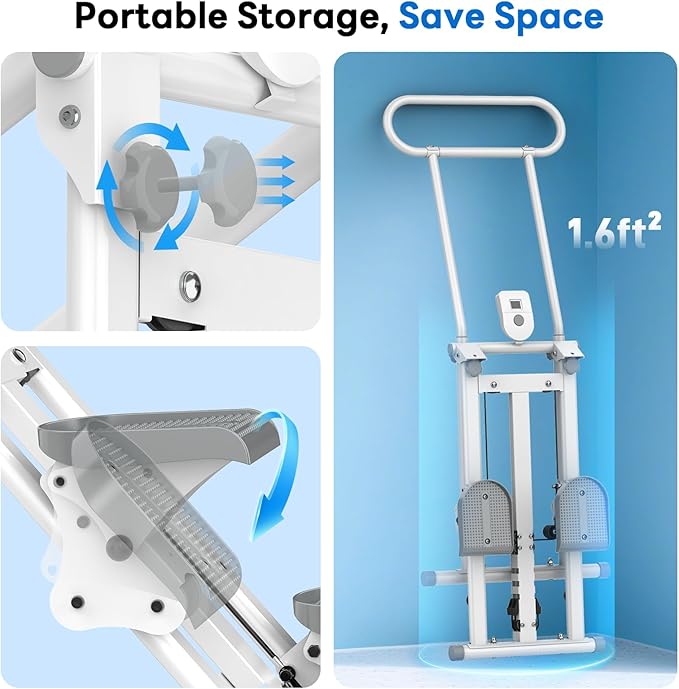 - Perfect for small apartments and spaces: The ERGOLIFE stair stepper with resistance for home folds in just one step, taking up only 1.6 sq ft. It can be slid under a bed or placed in a corner for storage, allowing you to exercise freely in a small apartment.