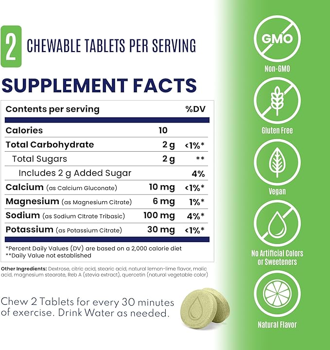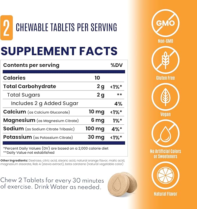 - CHEWABLE ELECTROLYTE TABLETS: Delicious and chewable bite-sized electrolyte tablets packed with sodium, potassium, calcium, and magnesium: the critical electrolytes lost through sweat.