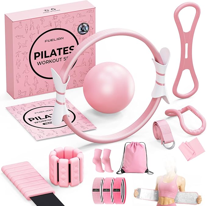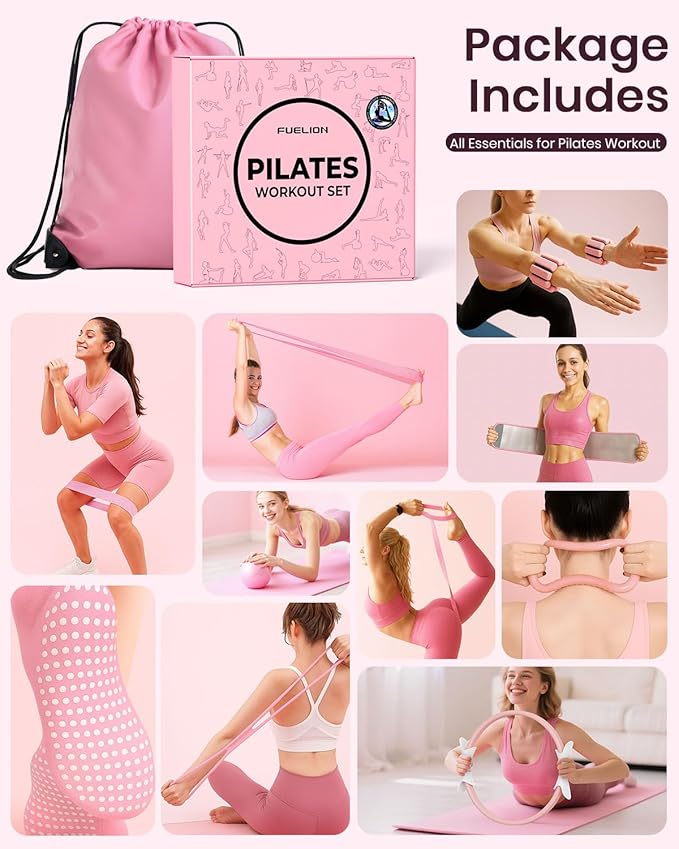 - [Comprehensive Pilates Equipment Set]: Essential for your Pilates journey, including a 14-inch Pilates ring, 9-inch non-slip ball, 2 1-pound adjustable wrist/ankle weights, 3 woven resistance bands, a TPE stretch band, and an 8-word pull rope. This combo meets efficient fitness needs.
