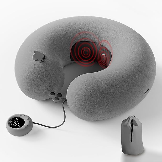 Inflatable Massage Travel Pillow for Airplane, Inflatable Travel Pillow with 6 Massage Modes and Compact Bag, U Shaped Neck Pillow for Airplane, Traveling, Train, Car, Sleeping, Office