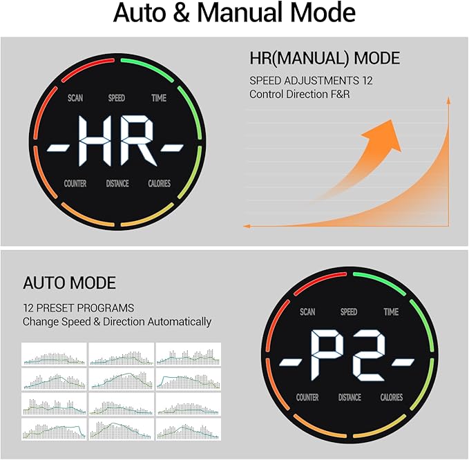 - Auto & HR Modes: This ellipse leg exerciser offers both manual and automatic modes. Manual mode lets you customize time (15-30 min), speed (1-12), and direction (forward or reverse). In auto mode that system programmed, speed changes every minute and direction changes every three minutes for a dynamic workout that targets different muscle groups through forward and backward motion