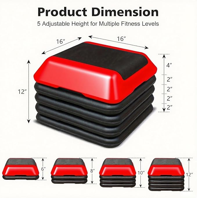 - 4 Adjustable Height Settings: Customize your workout intensity with 3 height options (4", 6", 8",12"). Easily adjust the platform using secure locking mechanisms, ideal for cardio drills, strength training, or low-impact rehabilitation exercises