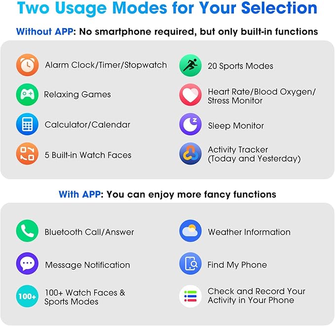 - No APP & Phone Required Pedometer Watch: The pedometer watch can be used seperately without APP or smartphone connections! It's easy to enjoy features like pedometer, stop watch and so on. Perfect for anyone looking for an easy fitness tracker without the hassle of smartphone setups.