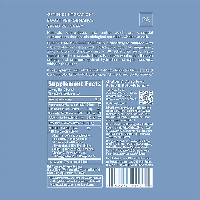 - LONG LASTING HYDRATION. Perfect Amino electrolyte hydration drink replenishes your body with complete electrolytes that are lost while you sweat. Take them on the go!