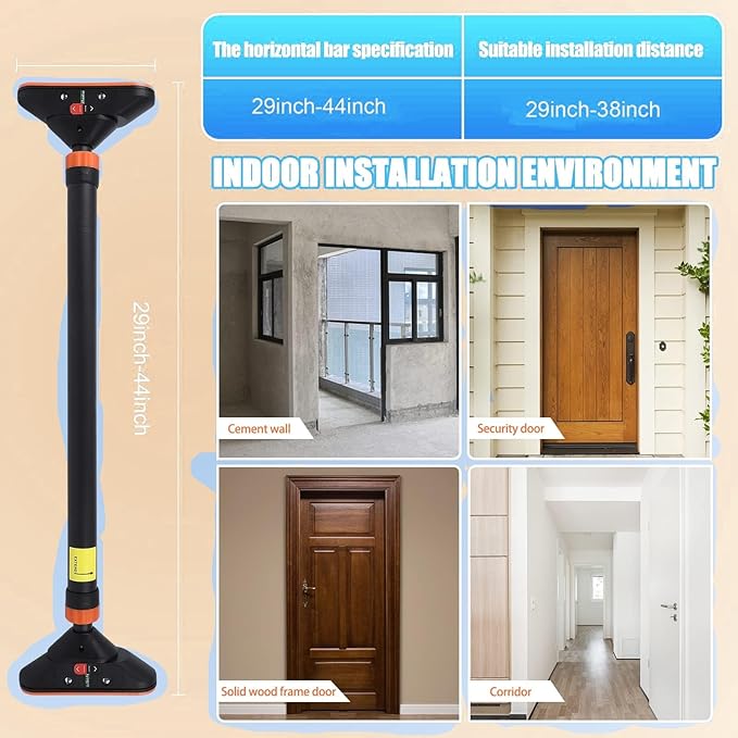 - 【Adjustable Width (29"-38.18") and Universal Fit】:Fits most standard doorways (74 cm-97 cm wide)—perfect for home, garage, or office use. Works on solid wood doors, security doors, and concrete walls (not suitable for fragile/glass door frames). No tools or drilling needed!