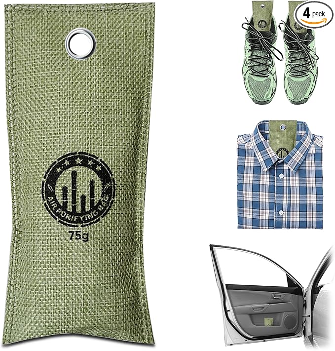 4 Pack charcoal odor absorber,Bamboo Charcoals Air Purifying Bag Charcoals Deodorizer Eliminator for Strong Odors in Car, Closet, Shoe, Basement (75G*4 Pack Green, Unscented)